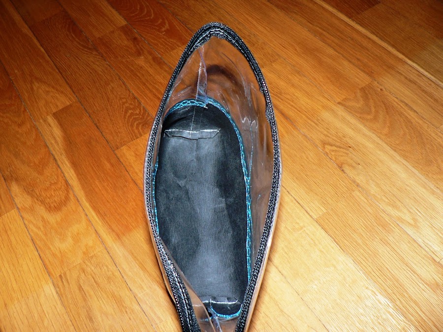 Es una confección muy sencilla. Tenía un retal de plástico de confección por ahí guardado. Como era pequeño pensé en ponerle una base de otra tela, pero al final lo hice con kraft-tex porque se puede mojar sin problemas, no pasa el agua (si no lo tiro a un charco), es resistente y le da cuerpo. Coser las dos piezas "al aire", es decir, sin alfileres ni pinzas ni nada, sólo con las manos y una al lado de la otra fue un reto. Pero creo que salí victoriosa.