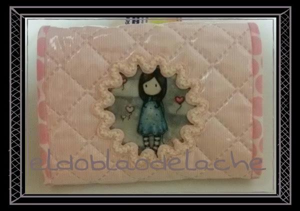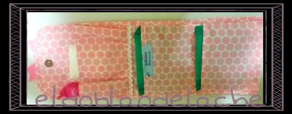 Exterior con tela plastificada, adorno de muñeca gorguss por un lado y lacito en el otro.