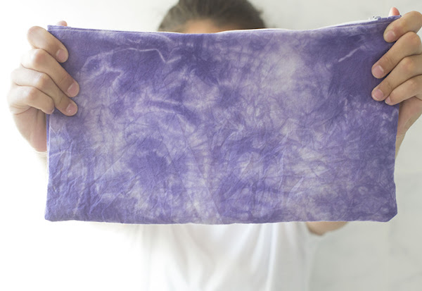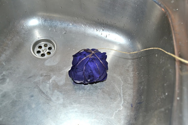 En mi caso no he hecho los clásicos pliegues, sino que he hecho una bola arrugada que he atado con una cuerda y que he sumergido en el tinte, preparado previamente...