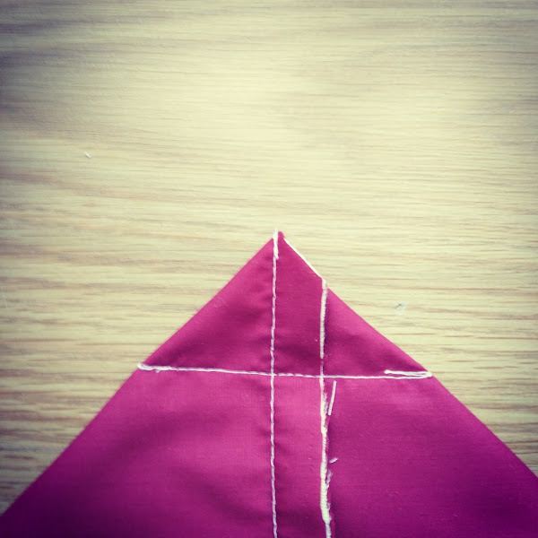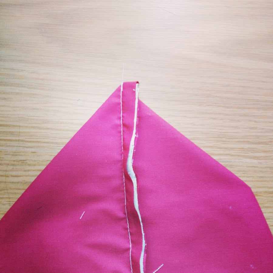 Ahora vamos a darle forma triangular de una manera muy sencilla dobla las esquinas formando un triángulo, de manera que la costura quede en medio y luego cose a los dos o tres centímentros, dependiendo de la profundidad que quieras del neceser.
