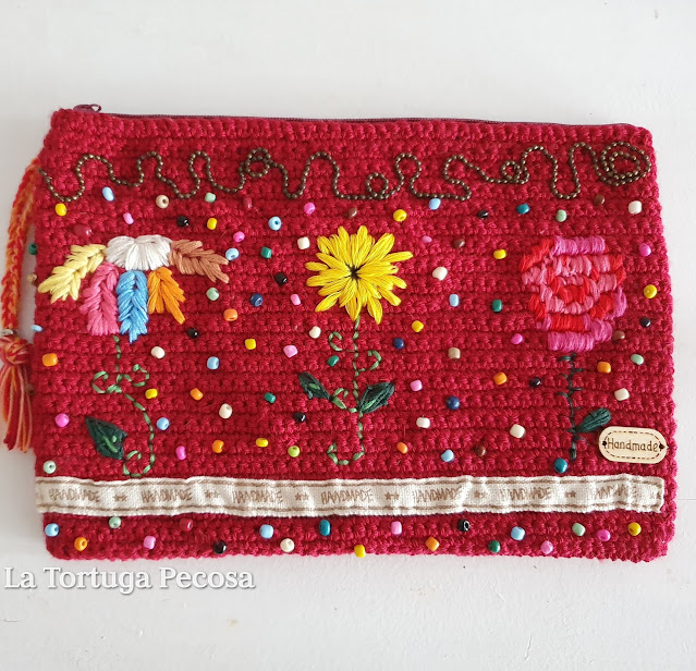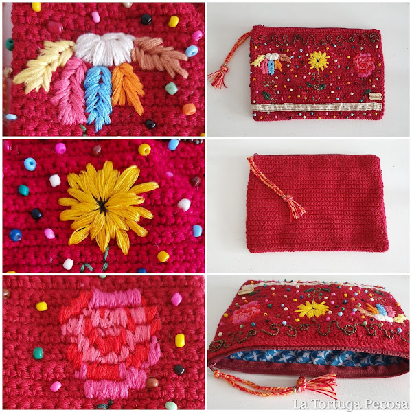 Hoy os quiero presentar el segundo de la colección de neceseres/ clutchs 100% hecho a mano, de ganchillo con hilo de algodón (número de ganchillo 3mm), en este caso a un sólo color (velvet) con detalles cosidos con motivos florales , forrado con tela de algodón, cremallera cosida perfectamente a mano por el Sr. Búho y con un asa para colgar de la muñeca.