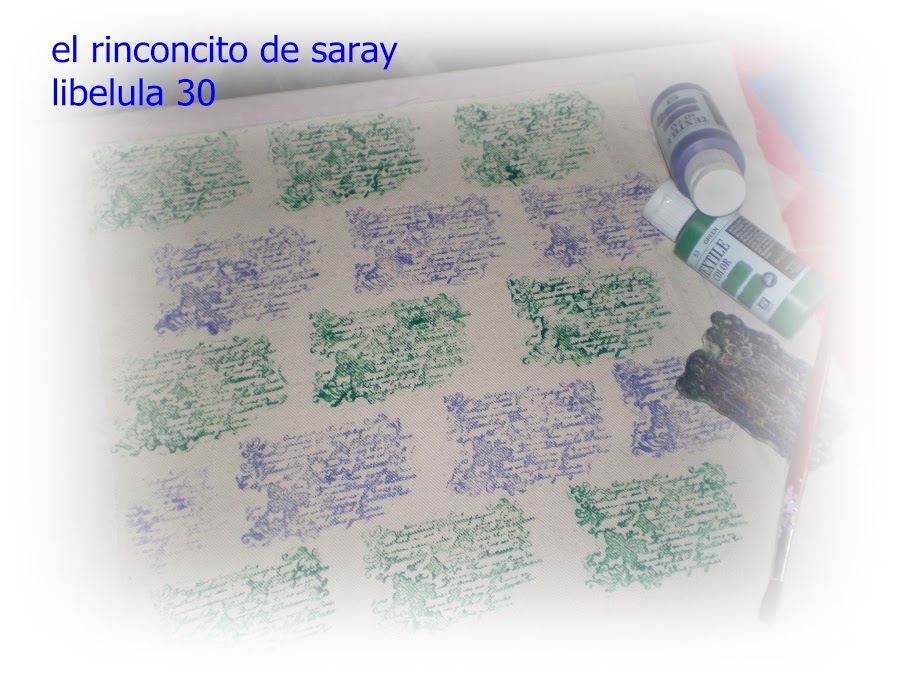 No me convencían las telas que tenia y se me ocurrió una idea tenia una loneta de color veis . Con pintura de tela de dos colores y un sello que tenia de testo fui haciendo el estampado