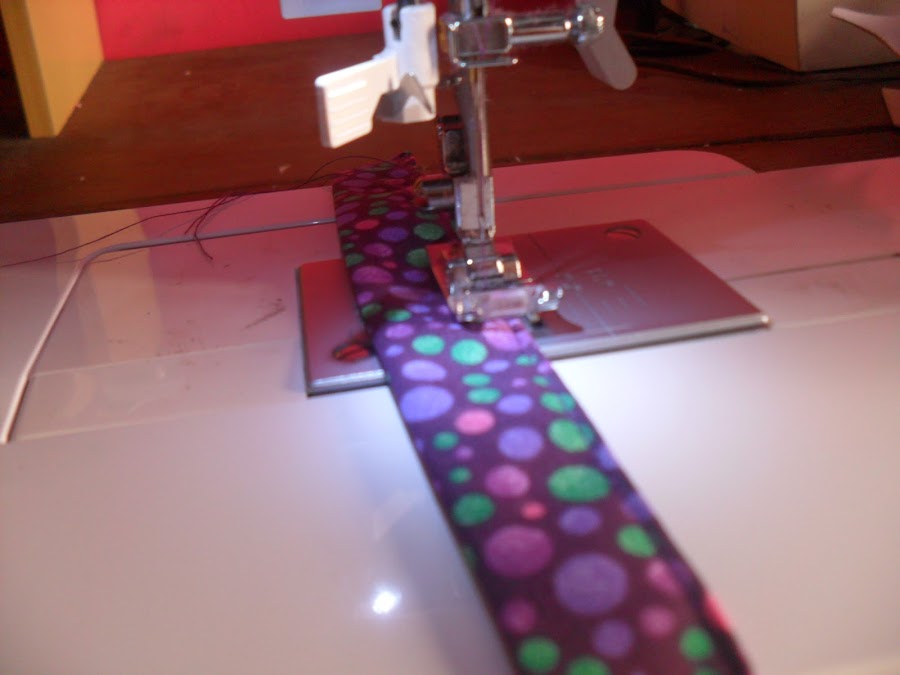 1- Vinque ao meio a tira de 7x30 cm, dobre as beiradinhas e passe uma costura. Reserve.