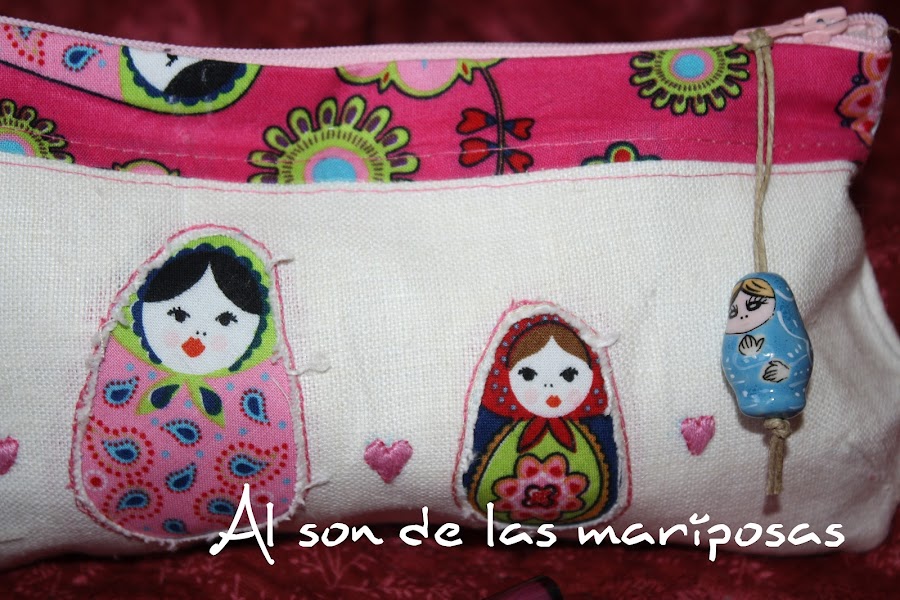 Combinación de lino y algodón, aplicaciones invertidas y pequeño bordado realizado a mano. Gracioso tirador, con una Matrioska de cerámica.