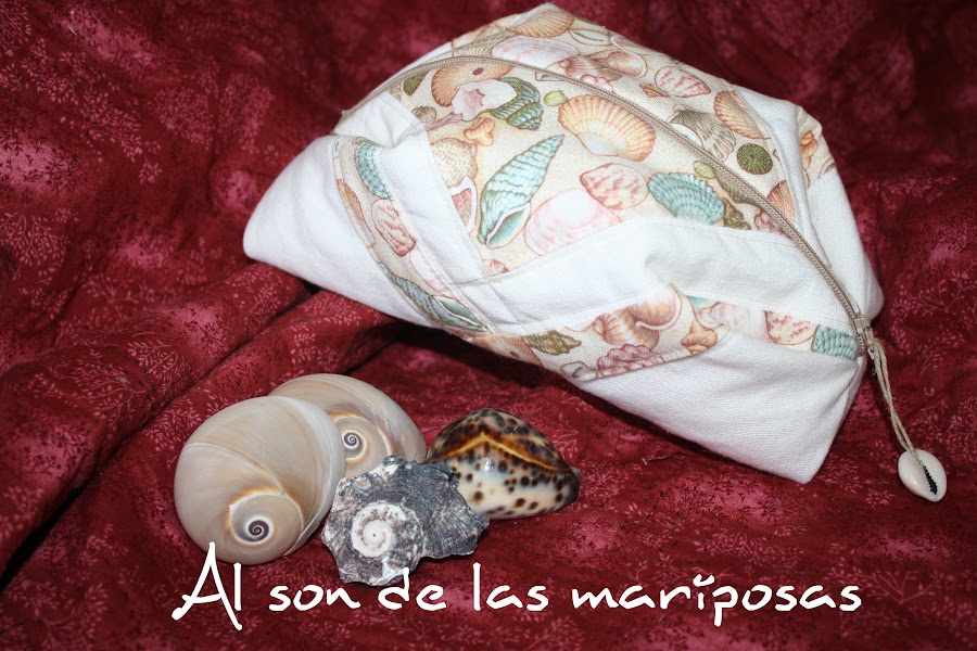 Neceser Patchwork, combinando telas de lino rústico y algodón. Acolchado a máquina. Simpático tirador de una pequeña caracola, a juego con las telas. Forro de algodón.