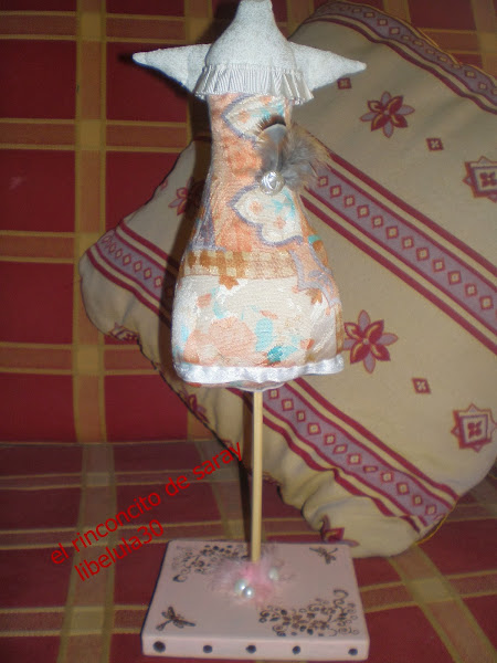 Me apunté a un sal para hacer el maniquí tilda que llevo tiempo pensando hacer desde que lo vi en una revista que compré y era un trabajo pendiente, pensé que era un buen momento para hacerlo y me puse manos a la obra. Este es el resultado utilicé una varilla de hierro roscada, una pajita de refrescos en color rosa para cubrirla l pedazos de tela que me habían sobrado, una florecilla de tul en ros ...