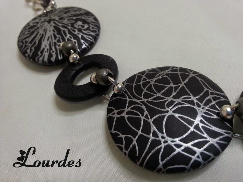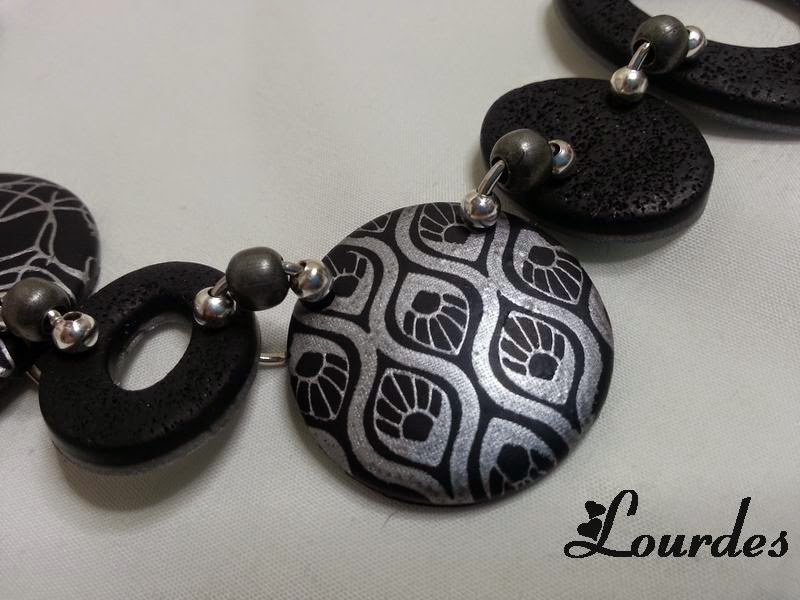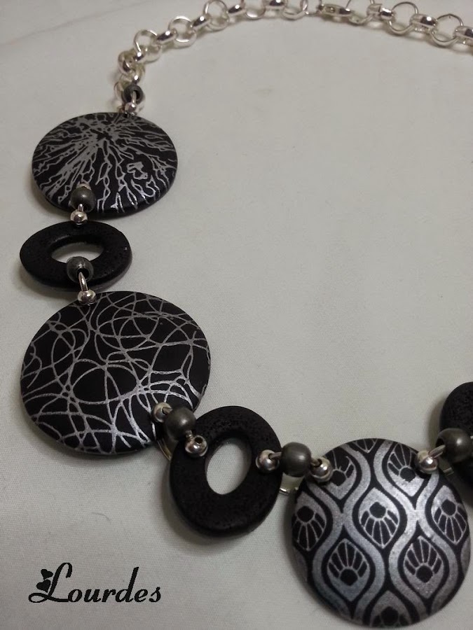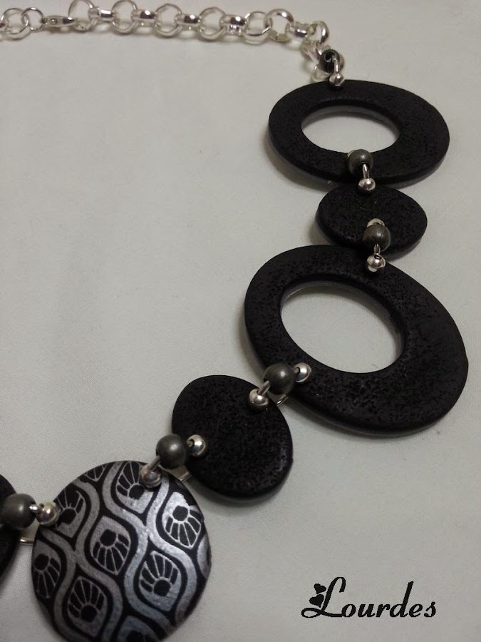 Collar largo de arcilla polimerica en color plata.Piezas con apariencia de arrugaAquí os muestro las piezas por la parte de detrás, que también están trabajadas de la misma manera.