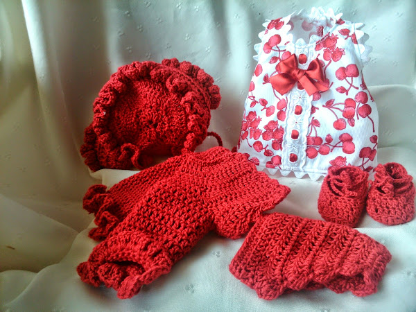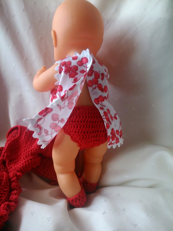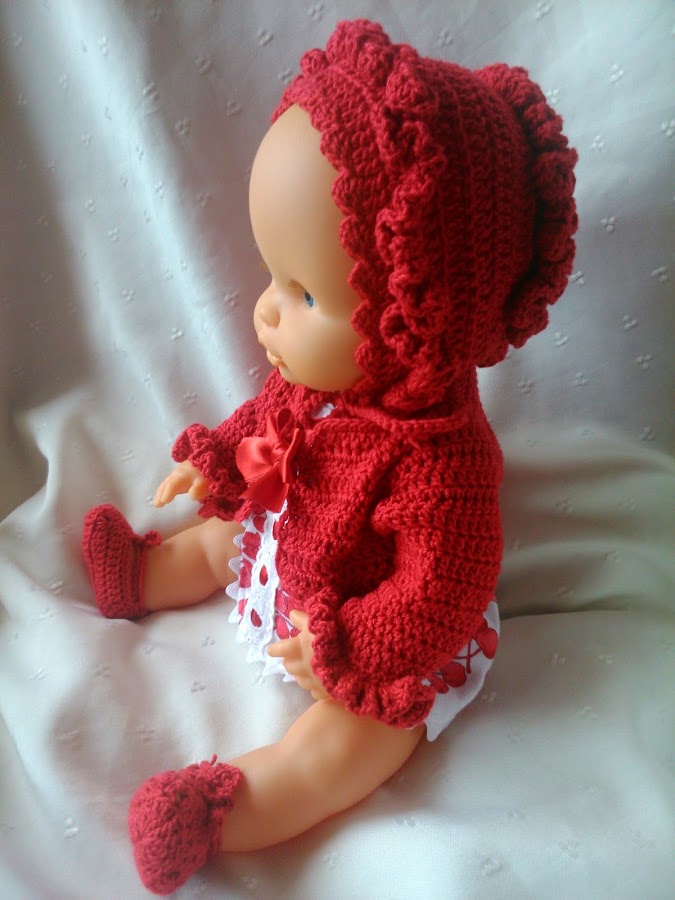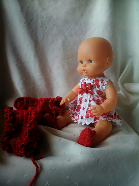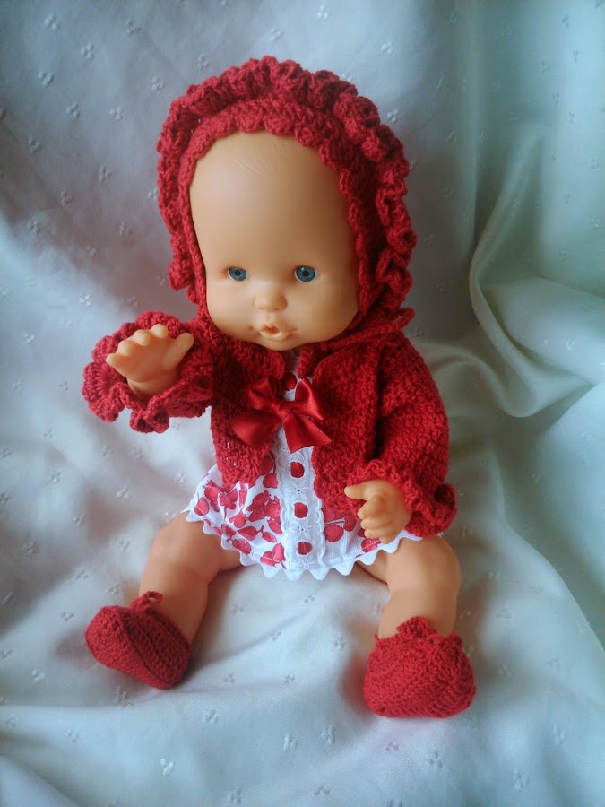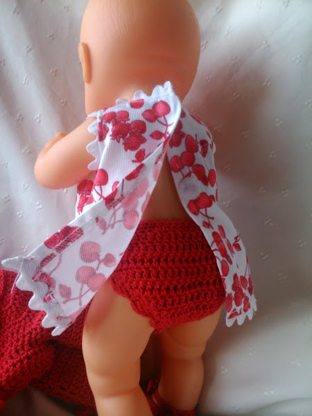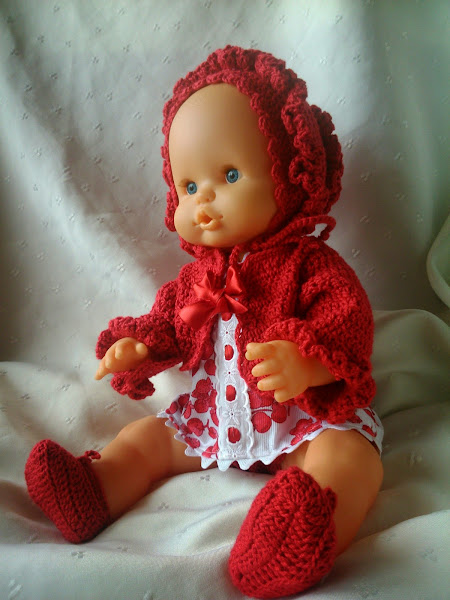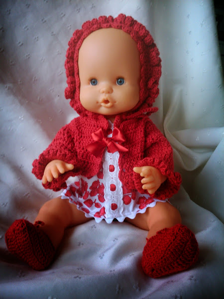 ...esta vez ,vestimos a los nenucos con el color rojo ...vestido en tela de pique...cerezas sobre fondo blanco ...la chaquetita y todos los complementos a ganchillo...una capotita muy original...