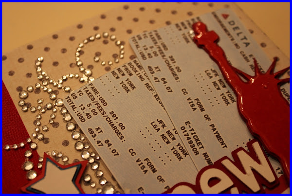 Esta es la portada, con un aire muy muy americano. Como se puede ver principalmente los colores utilizados son el azul, rojo y blanco... La estatua de la libertad es un recorte de la Cricut Expression, en cartulina roja y la silueta en un tono burdeos. Ésta lleva una gruesa capa de Glossy Accents para darle el toque brillante. La bandera y los billetes son simples impresiones. El recorte de la silueta de Nueva York también es un archivo de la Cricut, el borde está embosado con Polvos de Embossing y la silueta en sí, está envejecida con Distress Ink - Vintage Photo