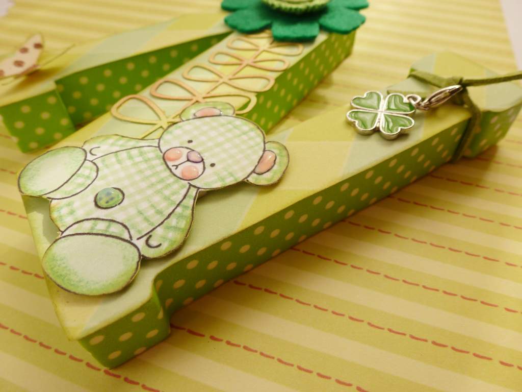 Esta superficie admitía poco adorno, así que sólo puse un troquel entintado, una mariposa a la que le hice motas con Stickles rojo, una flor combinada de fieltro y ganchillo con un botón de cuadritos vichy verdes, una hoja de trébol sujeta por cuero verde, y una imagen de un osito que utilizo mucho, me gusta cómo me mira.