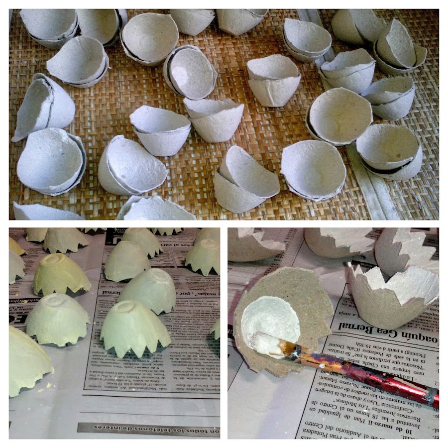 Cortamos la huevera de la manera que ves en la imagen y hacemos los picos para darle el aspecto de huevos.