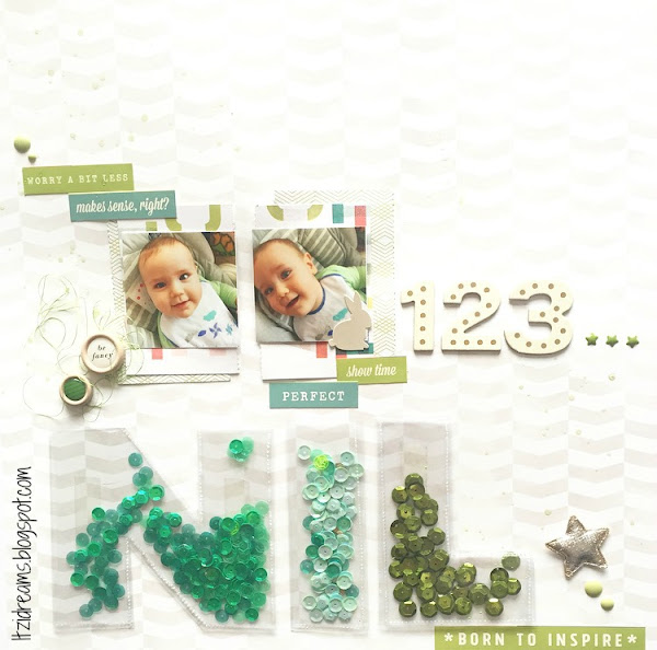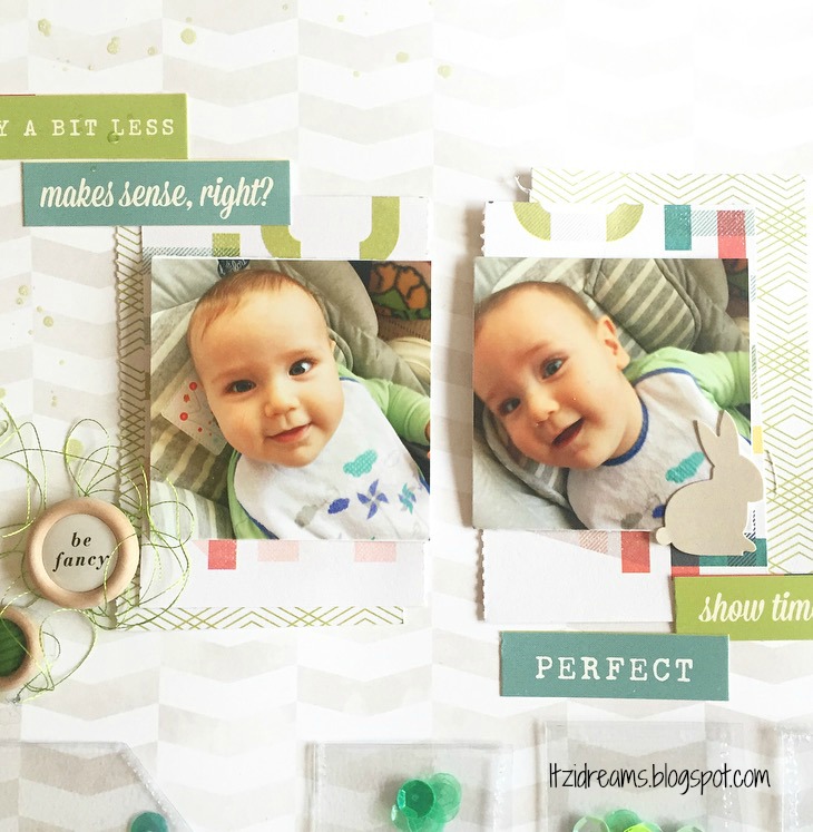 Para la Base escogí un papel de la nueva colección de Pink Paislee, algo neutro para que resalte todo el conjunto, (¡¡ Que me chifla!!) Para complementar el LO, utilicé restos de la colección True Stories de Shimelle. Como podéis ver utilicé la gama de verdes y es que normalmente me guio por los colores de la fotografía para escoger los complementos, tonos y materiales. En este caso la fotografía predomina el verde lima limón, pues los tonos escogidos son de esa gamma.
