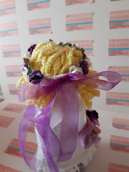 Tiara con flores lilas, moradas y blancas.