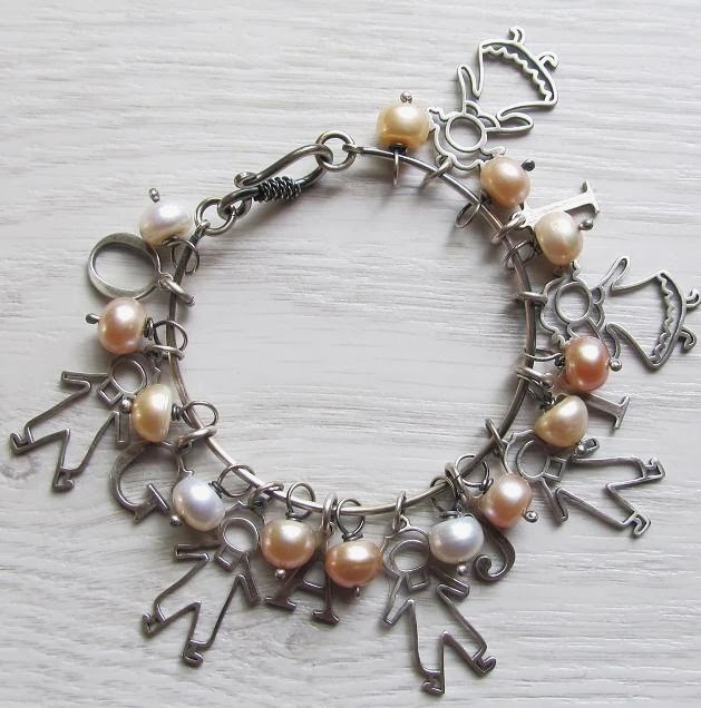 Pulsera de zamak con baño de plata para Sandra, con las iniciales y las muñecas representan a sus hijas. Espero que te guste y la disfrutes.