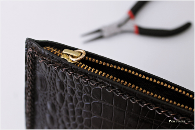 # Paso 7 (y último). Cambia el tirador del carro. Yo lo corté con unas alicates y lo cambié por un aro dorado y un trozo de piel rematado con un adorno metálico: