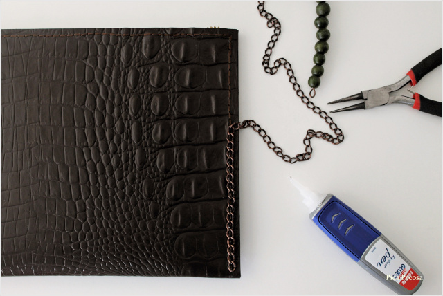 - Un trozo de cadena para tapar las costuras (opcional). Yo lo hice porque a pesar de haber hecho los agujeros guiándome con una regla, algunas puntadas quedaron torcidas y no me gustó el resultado.