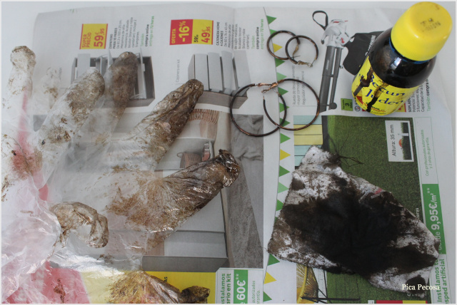 * NOTA: EL BETÚN DE JUDEA SE COME EL SPRAY DORADO: No sé si el tipo de pintura influirá, yo utilicé uno que me sobró de otro trabajo y que se utiliza para usos profesionales, no de manualidades. Cubre muchísimo y queda un dorado amarillo muy brillante, pero al aplicarle encima el betún después varias pasadas el dorado desaparecía (aunque a mí me vino bien para el efecto que buscaba):