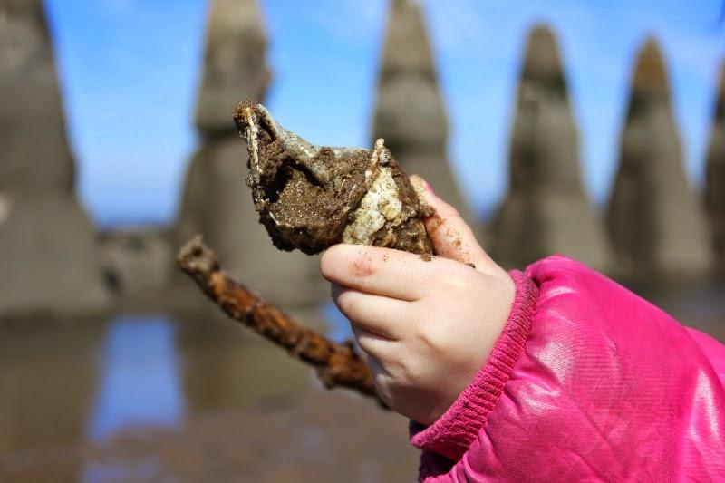 El recorrido hasta la isla se hace siguiendo unos pilones (antigua defensa anti-submarinos de la Segunda Guerra Mundial). Hay un largo espigón a la izquierda de los pilones por dónde la gente camina hacia la isla pero nosotros os recomendamos ir por la derecha, por la arena que la marea baja deja al descubierto. Con las botas de agua calzadas, los charcos se convierten en pequeños tesoros llenos de conchas, palos y piedras.