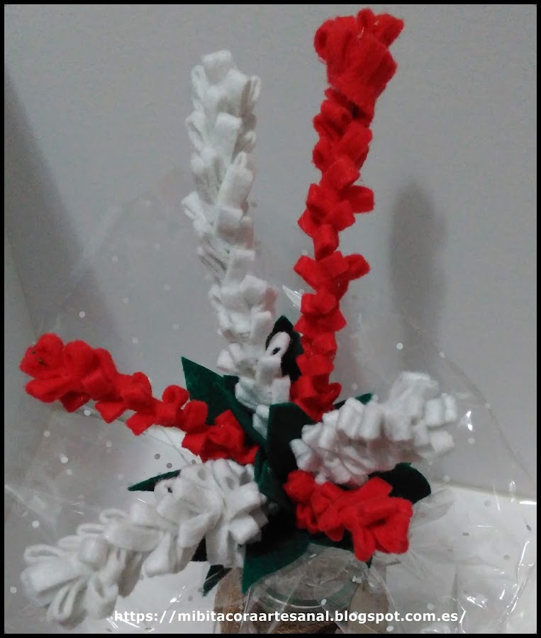 Tenía muchas ganas de realizar unas varas de lavanda, a ella se las hice en roja y blanca, sus colores favoritos, y mirar por dónde se presentó la ocasión para hacerlas.