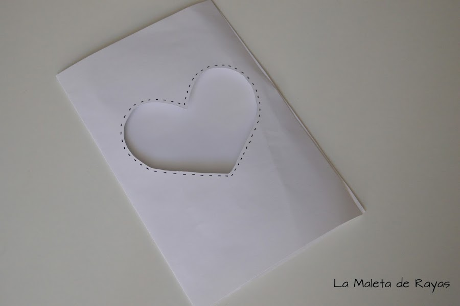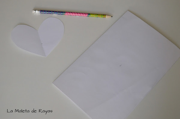 Al igual que antes doblamos la cartulina a la mitad y marcamos el centro. En un folio aparte hacemos una plantilla en forma de corazón y la recortamos.