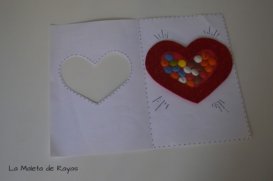 Cuando esté todo pegado, ahora sí, pegamos el corazón en el interior de la cartulina, con cuidado de que quede centrado con la parte de delante.