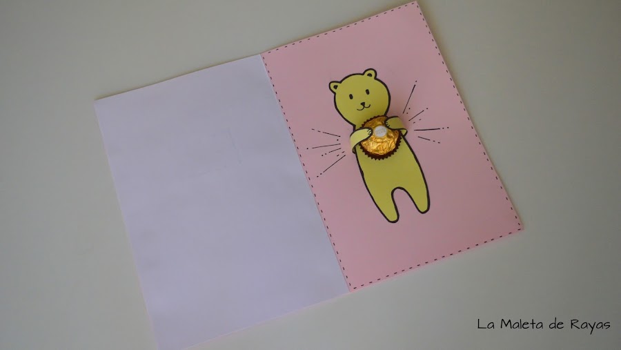 Pegamos los brazos al cuerpo y después a la parte de dentro de la tarjeta. En el centro del oso pegamos el bombón con silicona caliente y los bazos de manera que nos quede algo así: