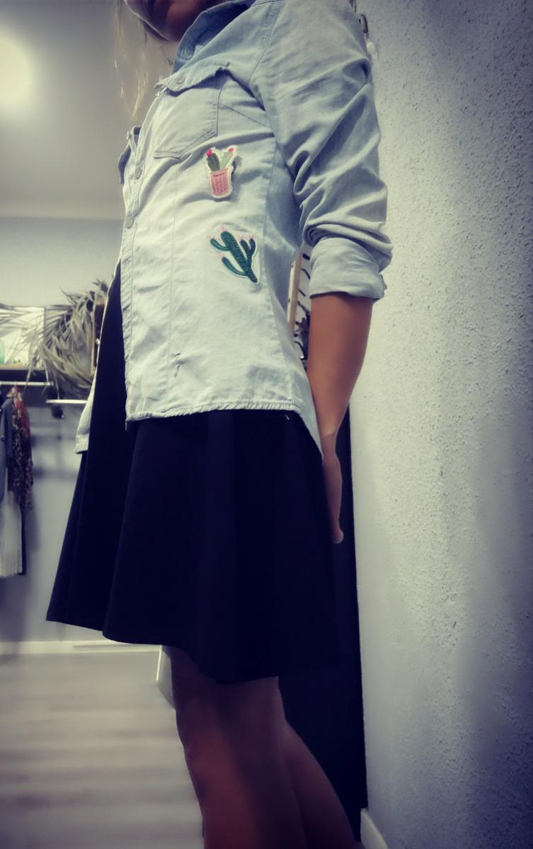 Otra opción es una prenda con algún agujero, os enseño una idea de una camisa vaquera rasgada a la que hemos dado un look nuevo y actual con dos simples parches.