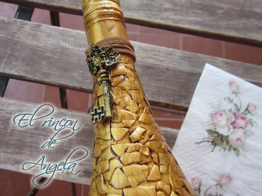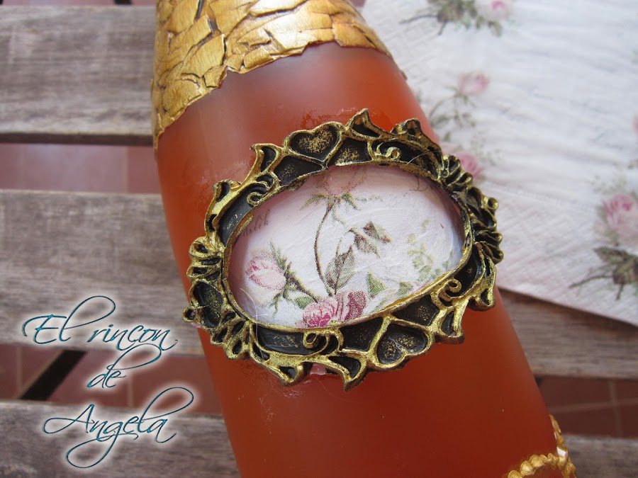 Con cola blanca y cascara de huevo, hemos hecho el craquelado. Luego una base de imprimación, para después pintar todo lo craquelado con pintura acrílica dorada. Un toque de cera para envejecer y algún adorno mas. Un trabajo muy completo con un resultado extraordinario.
