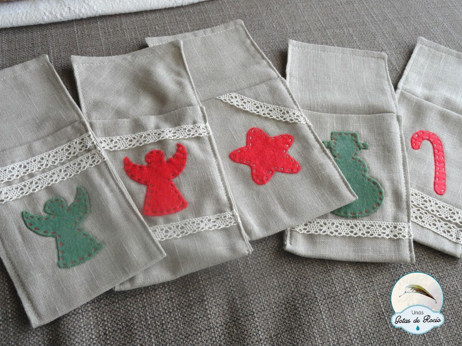 Este año me pidieron bolsitas de lino con aplicaciones navideñas en fieltro y decoradas con una puntilla. El destino es depositar los cubiertos de cada comensal en la cena de Nochebuena.