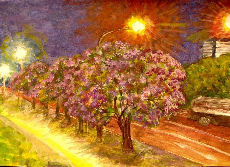 !!El purpley flores de color rosa que recubre la calle con el cielo y la calle luces moradas estallando en luz es un tema que uno podría quedar atascado en! Me alegro de que pintaste otra versión, Maria. El siena tostado unificar los troncos de los árboles y por carretera y luz de calle halos en la noche es la sombra que da el contraste de luces de color amarillo. Uno siempre necesita la oscuridad para sacar a la luz, como una técnica y una perspectiva filosófica. Se le da profundidad. Su obra tiene una explosión de color y energía que atrae a uno de cada! Me encantaría caminar por esa calle y oler las flores, guiados por las luces mágicas. En la parte superior derecha, el hombre hizo artefactos desaparecen de nuestros árboles preciosos. Texto de Nancy Zola