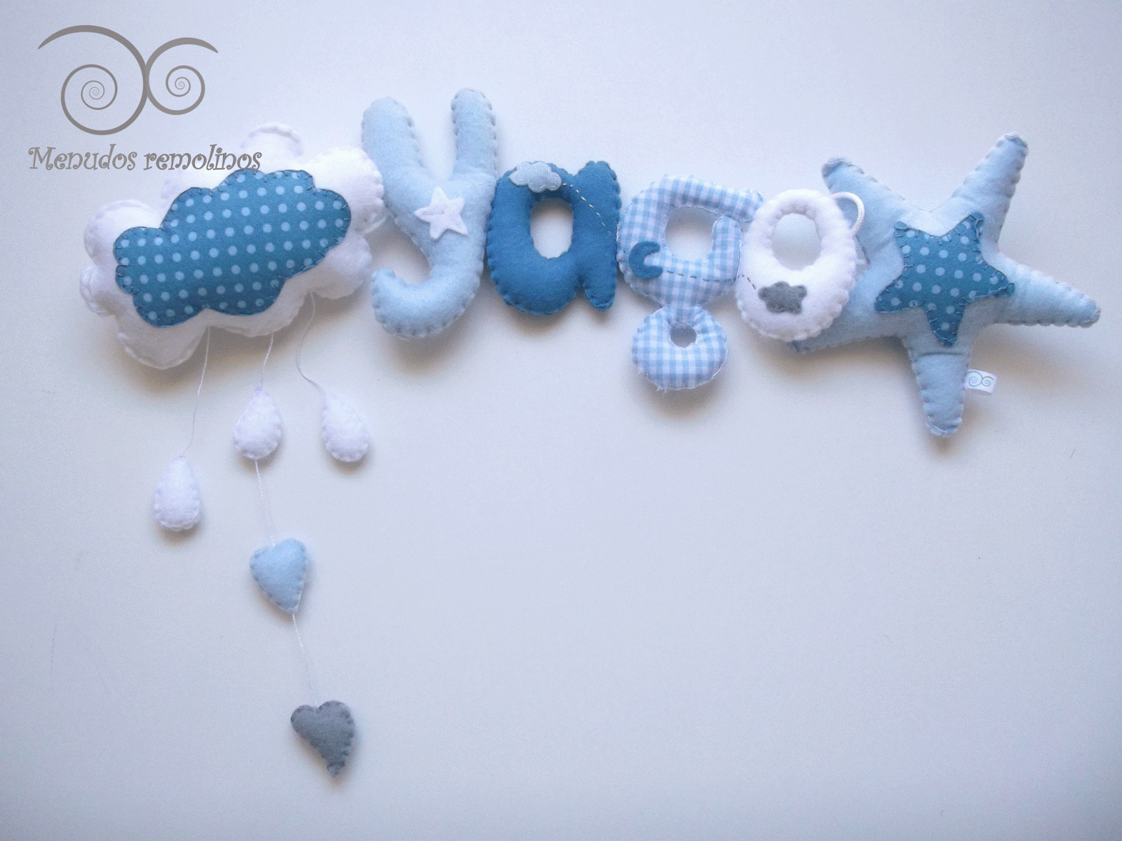 Sus instrucciones para realizar las letras en fieltro fueron muy precisas y muy extensas, ya que quería una combinación de detallese había visto en diferentes modelos de letreros.Quería que fuese : "los colores como el modelo de "CÈSAR" con una tela de cuadritos o lunares azules,blanco,azul bebe y azul más oscuro,... y de terminaciones:1 nube ,igual que la del modelo "IRENE" con 2 corazones, uno azul y el otro de otro color, y la otra terminación, una estrella de 5 puntas ...También me gustaría que las cuatro letras llevaran el pespunte y algún motivo(estrellita,nube,luna...)como el nombre "ÈVOLE"