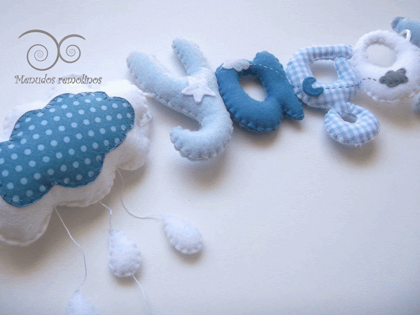 Sus instrucciones para realizar las letras en fieltro fueron muy precisas y muy extensas, ya que quería una combinación de detallese había visto en diferentes modelos de letreros.Quería que fuese : "los colores como el modelo de "CÈSAR" con una tela de cuadritos o lunares azules,blanco,azul bebe y azul más oscuro,... y de terminaciones:1 nube ,igual que la del modelo "IRENE" con 2 corazones, uno azul y el otro de otro color, y la otra terminación, una estrella de 5 puntas ...También me gustaría que las cuatro letras llevaran el pespunte y algún motivo(estrellita,nube,luna...)como el nombre "ÈVOLE"