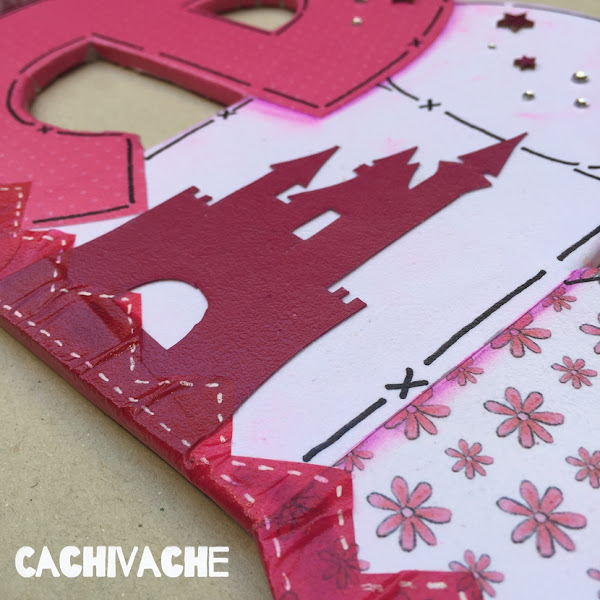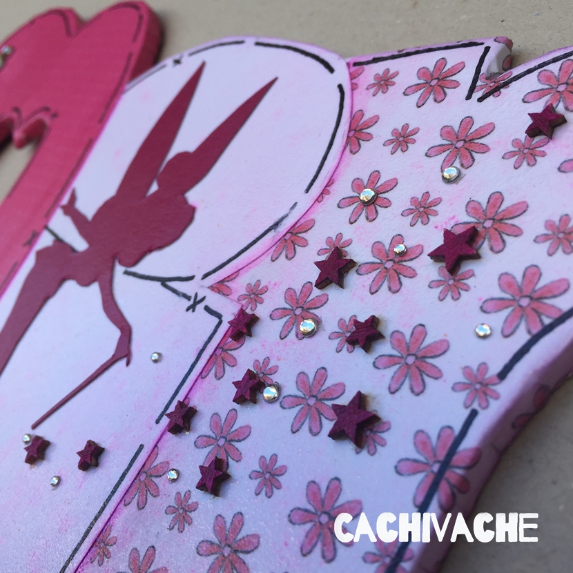El de Mireia es en tonos rosa magenta y blanco y como motivo elegí campanilla, que le va perfecta a la decoración de su habitación. Además de unos brillantes y estrellas que parece que hayan salido de la barita.