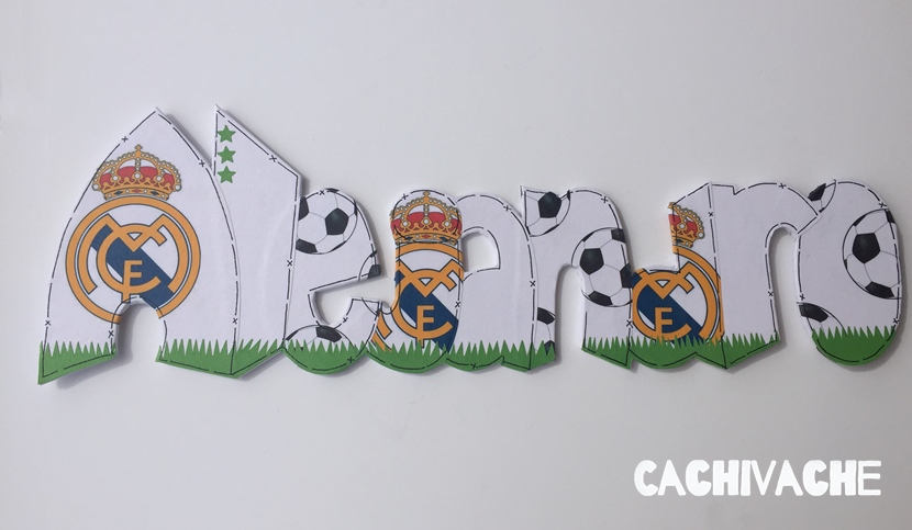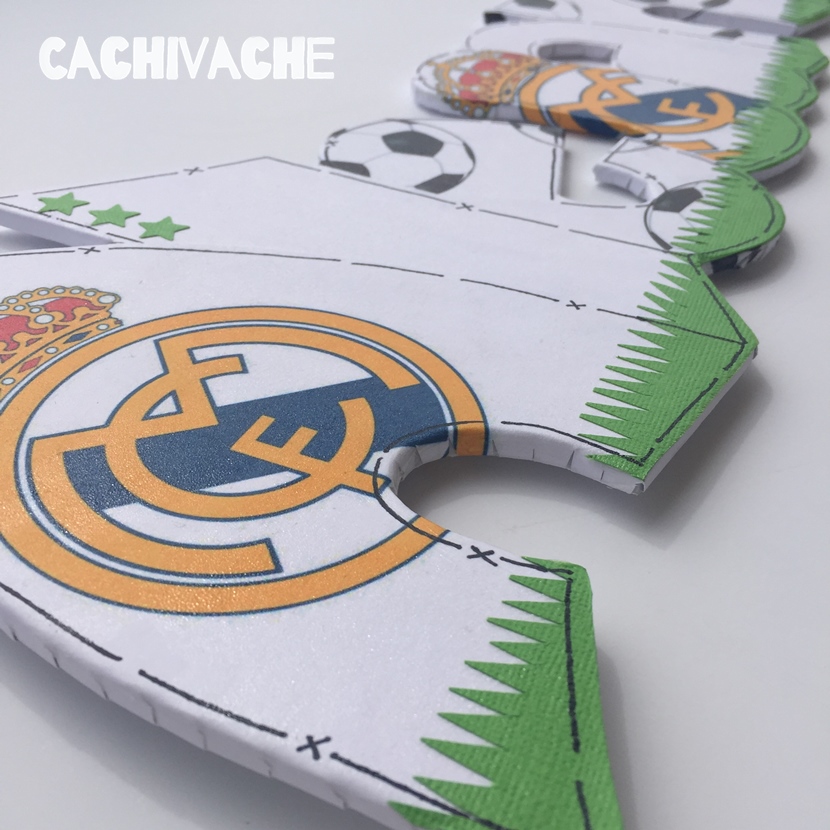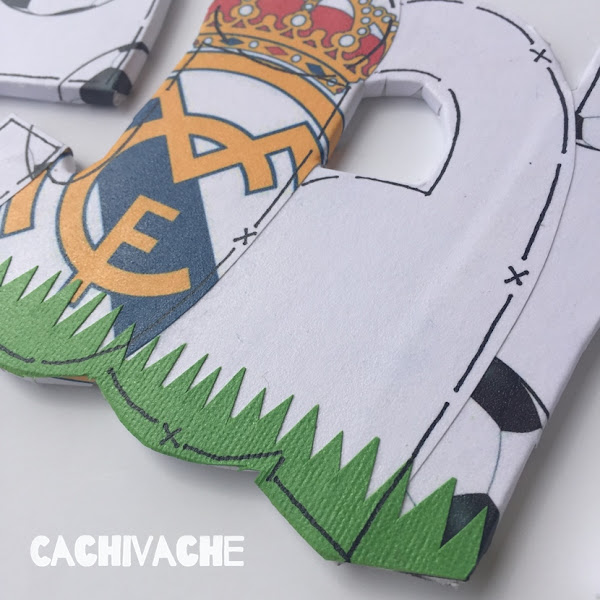 Es el papel el que sirve de decoración con el escudo del Real Madrid y unas pelotas, alternando las letras.