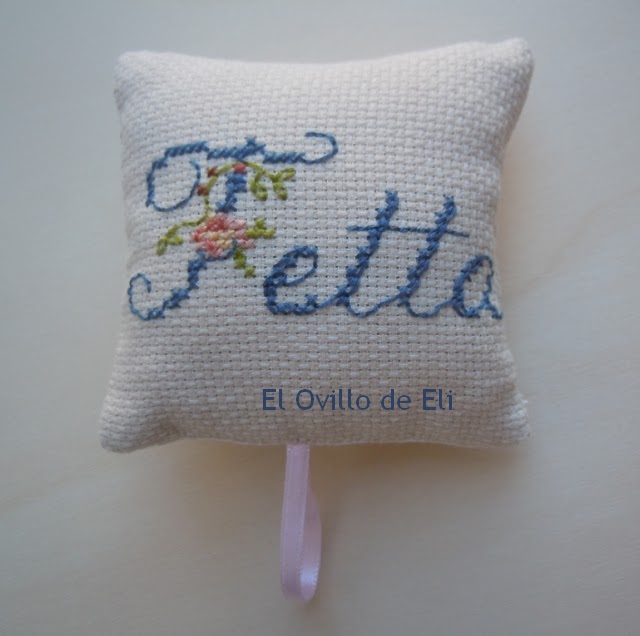 Por mencionar algunos detalles, la tía que ha recibido este regalito, gusta mucho de bordar un técnica de Ricamo típica del sur de Italia. Siempre la veo bordando, mañana y tarde, así que pense en hacerle un alfiletero y en cuanto tube las letras practicamente se hizo solo. El relleno también fue complicado de conseguir, ya que quería comprar "guata" que es una fibra sintética para relleno de cojines, de la cual me sería dificil hacerme explicar, así que use hule espuma cortado en pedacitos, que era lo que había. Por último, coloque este listón rosa para que de aquí ella colgara sus tijeritas. Lo termine y al día siguiente fui a su casa a regalarselo y lo primero que me dijo fue "porque le pusiste el listón abajo, era arriba" le explique que era para el cordoncillo de las tijeras. Recientemente vi que el listón que va para abajo, lo cocio pegado por la parte de atrás, subiendolo, para colgar el alfiletero en la pared de su sala :")