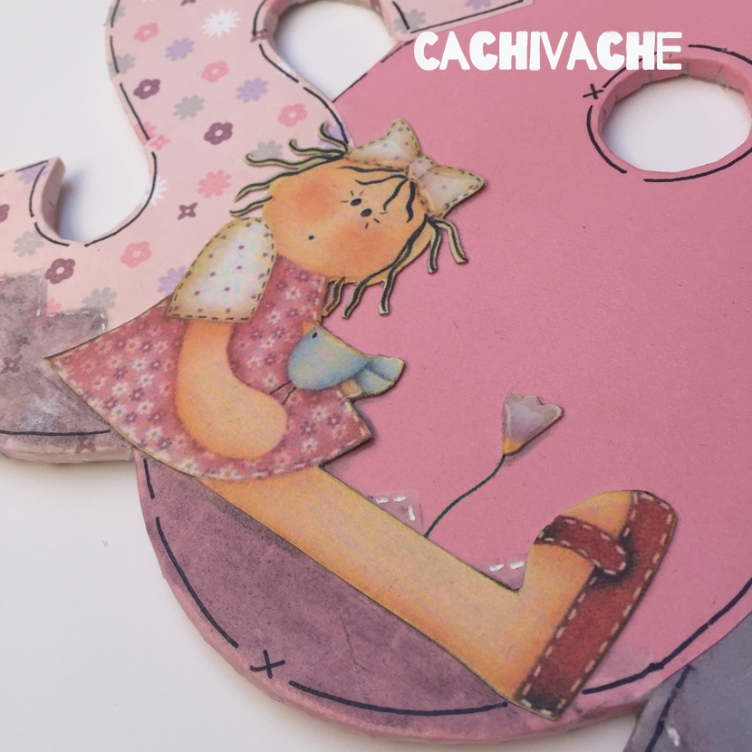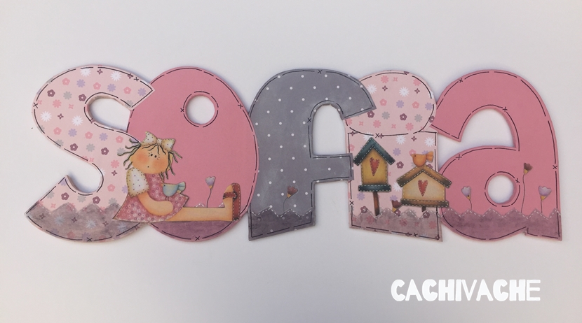 Es un nombre personalizado para niña, en tonos rosas y grises y con una muñequita como protagonista principal.