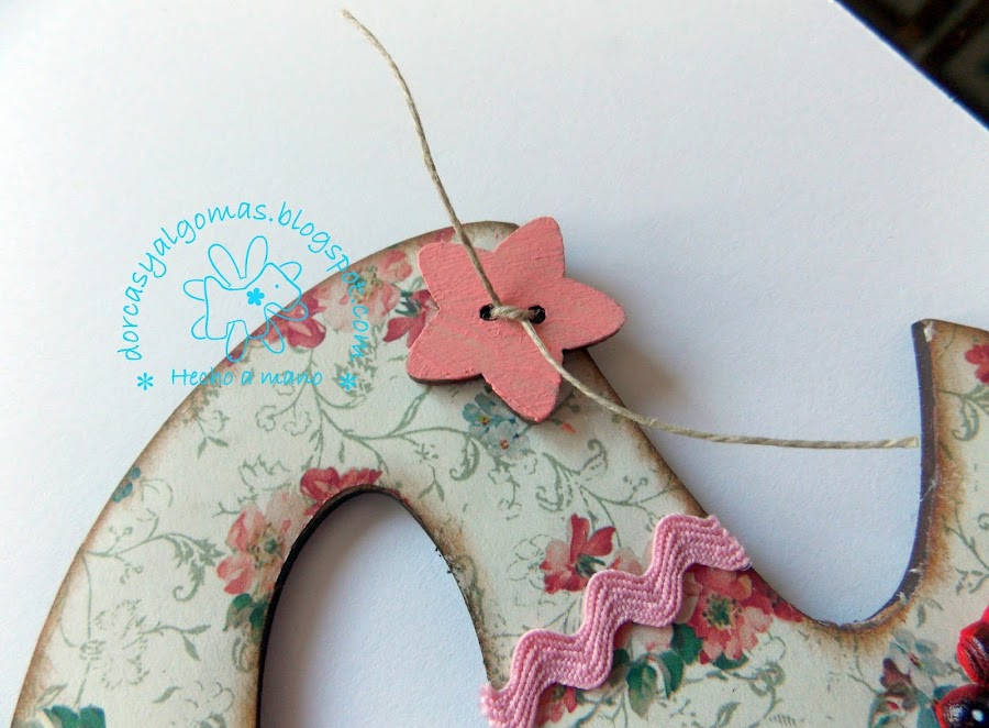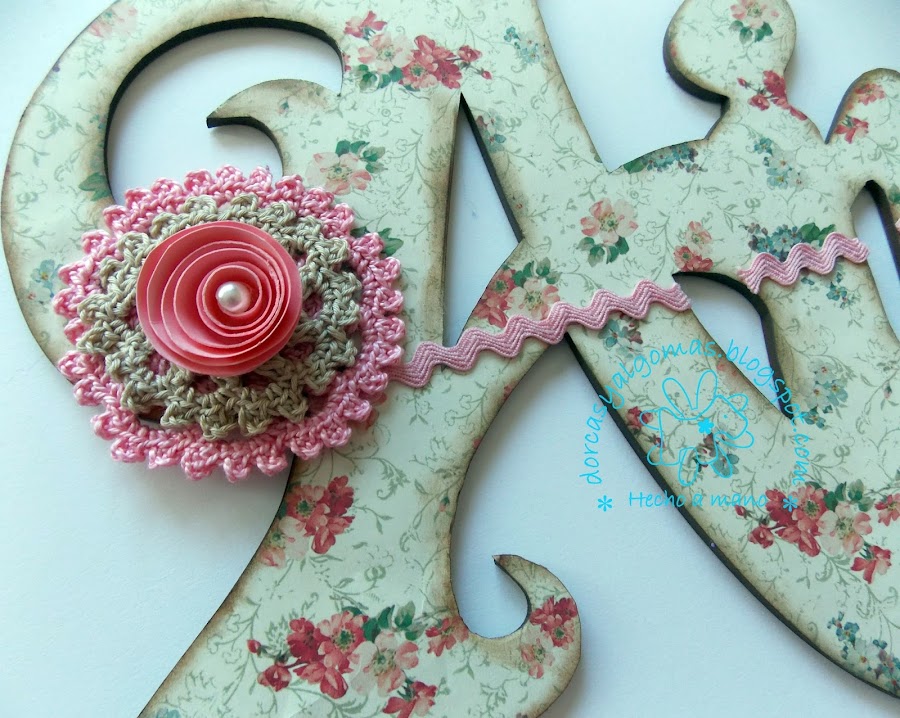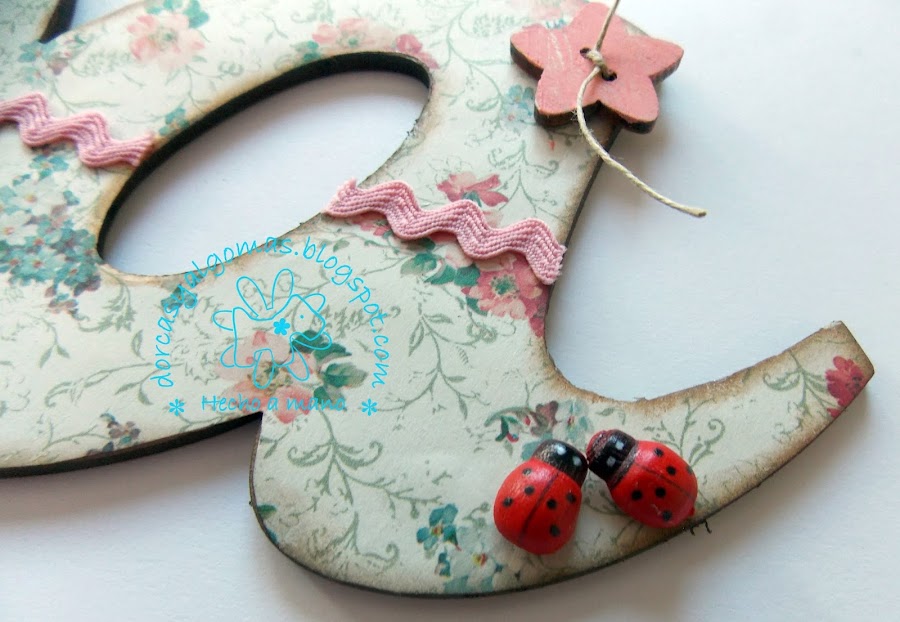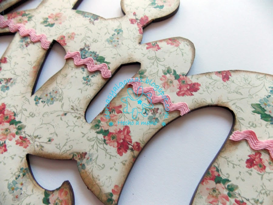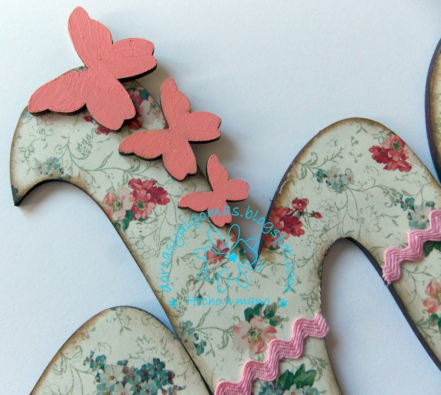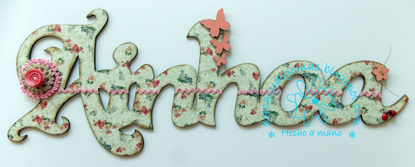 Hoy os muestro el nombre Ainhoa en madera y decorado con papel y detalles de scrap.
