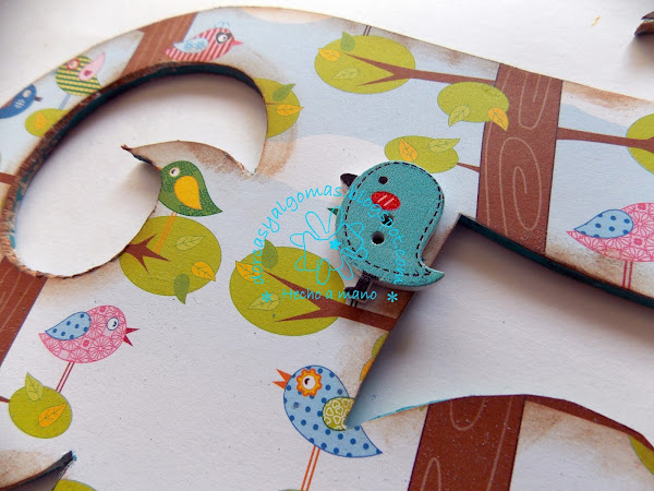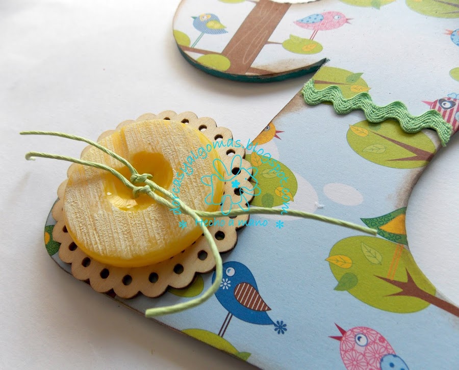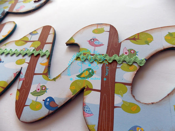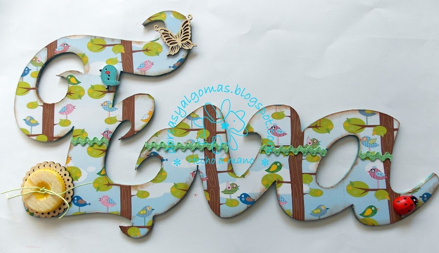 Hoy os muestro el nombre de mi sobrina Eva en madera y decorado con papel de scrap y diferentes adornos.