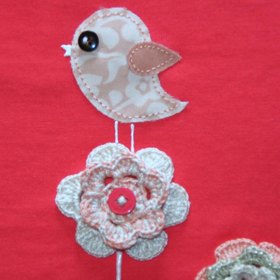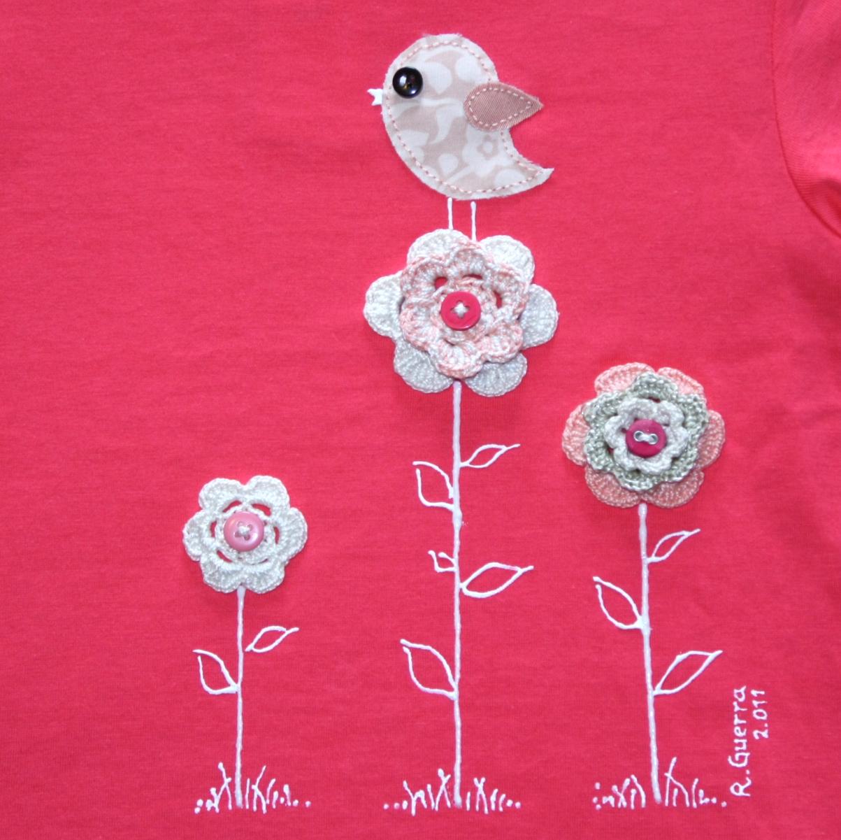 En realidad, hice también una pequeña horquilla para el pelo, con un adorno de flor de crochet como el de la camiseta y la rebeca, pero no le hice fotos. Cuando las tenga, las colgaré por aquí y si es posible puesta en su dueña, pues mejor ;-).