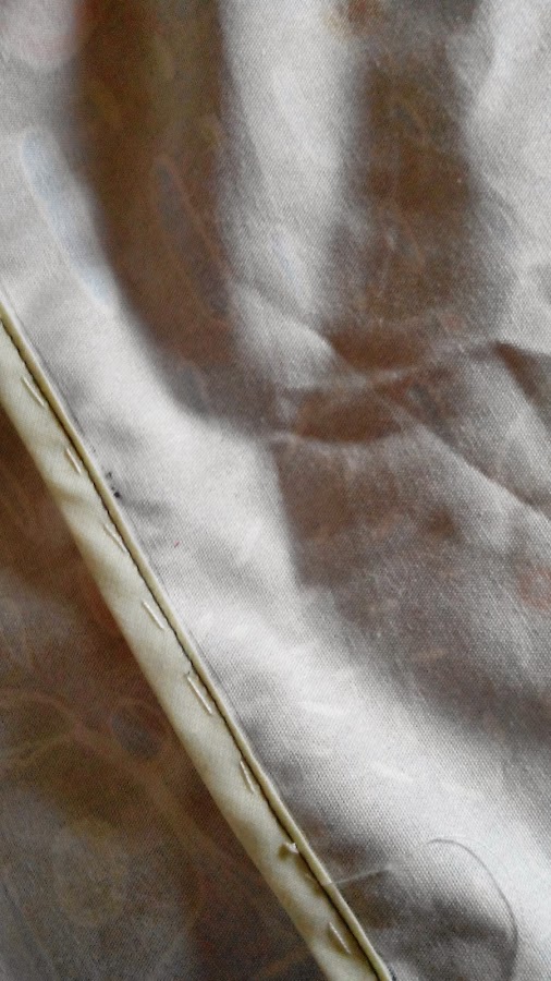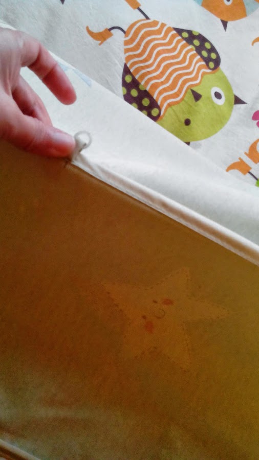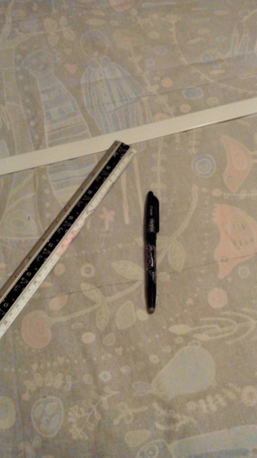 Nos ayudamos de la pieza ancha de abajo que lleva el estor para utilizarla de regla y con un bolígrafo para tela vamos trazando las lineas en nuestra nueva tela, esta tinta desaparece al calor de la plancha.