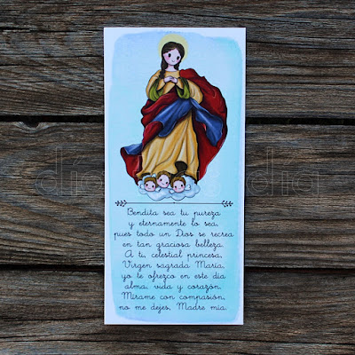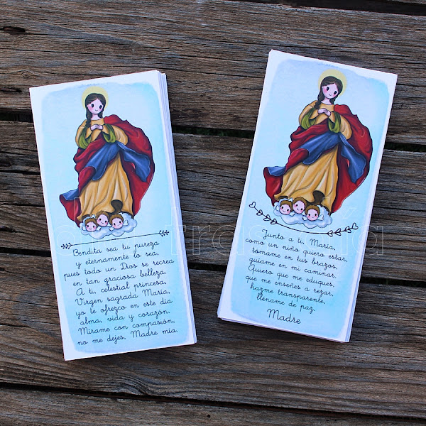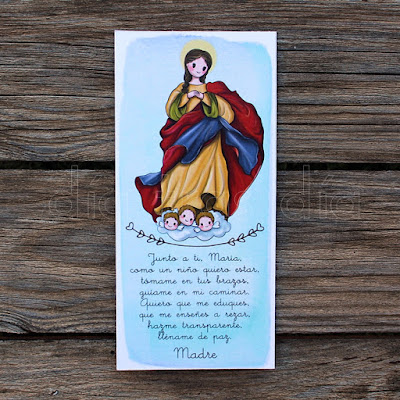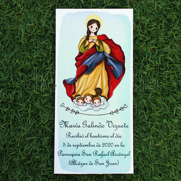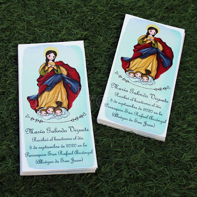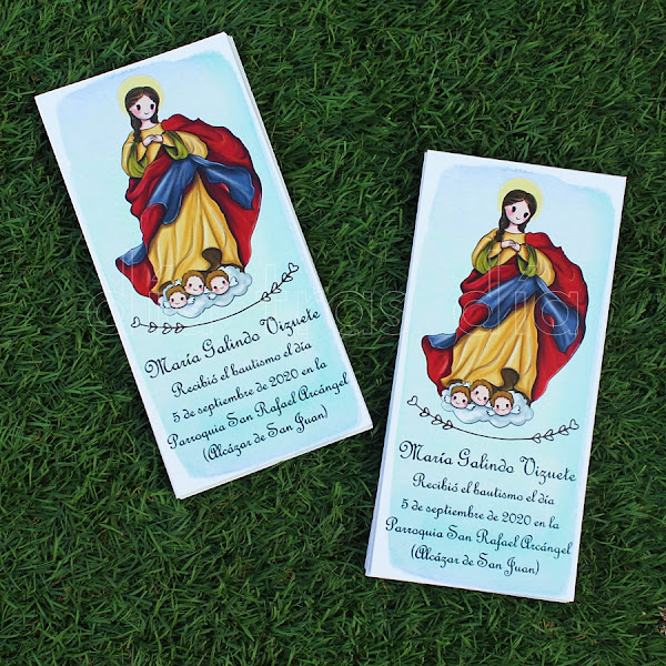 Ella había visto las invitaciones de bautizo que hice en anteriores ocasiones, pero la idea de que llevase dibujado un bebé no terminaba de convencerle. Pero había visto unos marcapáginas que yo preparé para regalar a mis chicos del coro de la parroquia, con la Virgen de la Asunción, patrona de nuestra localidad, como protagonista. Me planteó que si sería posible hacer los recordatorios con ese mismo dibujo y con los detalles del bautizo de su hija en el texto. Creo que no he llegado a enseñaros por aquí esos marcapáginas, así que os dejo unas fotos para que veáis como quedaron: