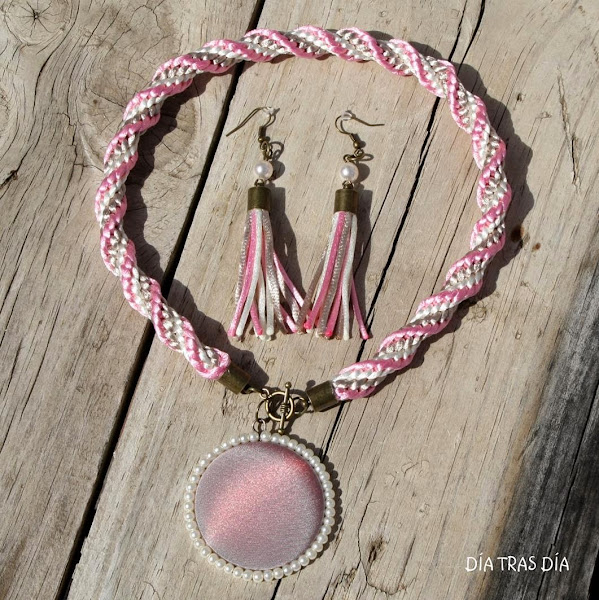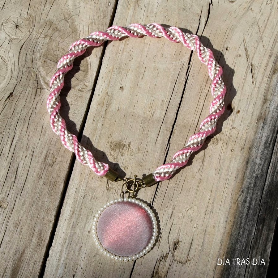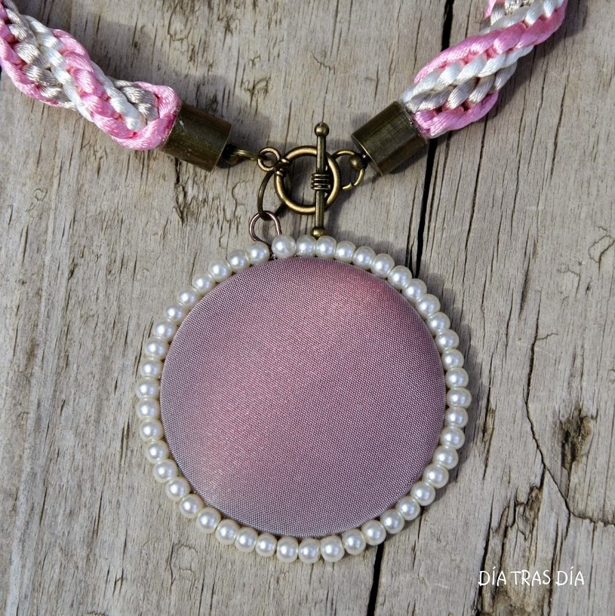 Pues con una combinación de cordones de raso que iban a juego con los otros complementos, hice esta gargantilla, con su correspondiente colgante realizado con la misma tela del bolso y los broches: