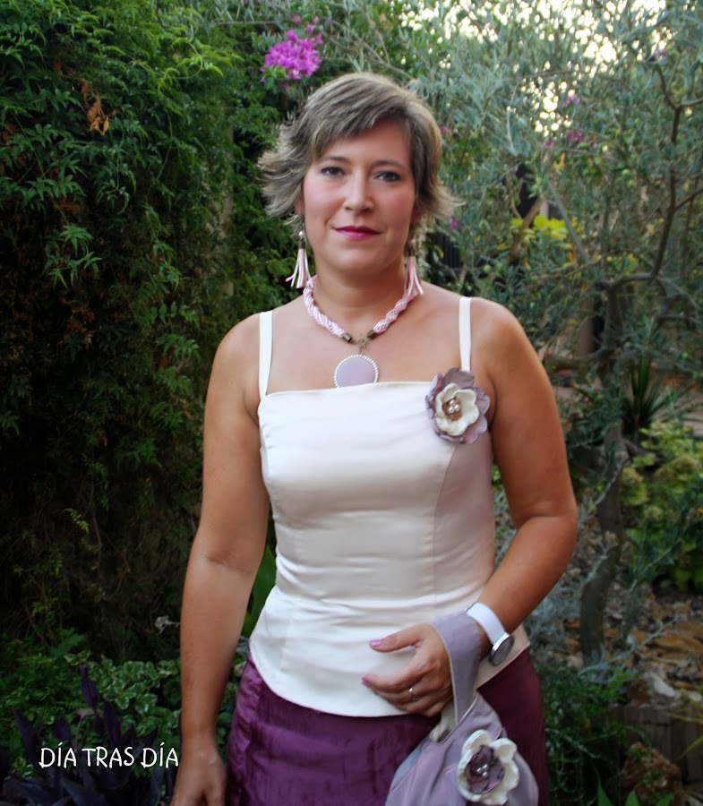 Resulta que andaba buscando alguna prenda para arriba en color beige y no terminaba de dar con nada que me llenase del todo. Y de repente, pocos días antes de la boda, recordé que en casa de mis padres seguía guardado mi vestido de novia después de algo más de 11 años. Así que le pedí a mi madre que lo rescatase y ni corta ni perezosa, tijera en mano, me entretuve en destrozarlo un poco. Realmente tampoco fue tanto destrozo. Mi vestido, aún siendo una sola pieza, estaba formado por dos piezas (top y falda) que la modista me propuso unir para que no me diese la lata tener las piezas separadas el día de la boda. Por tanto, sólo tuve que entretenerme en descoser ambas piezas y volver a rematar el top para dejarlo bien terminado.