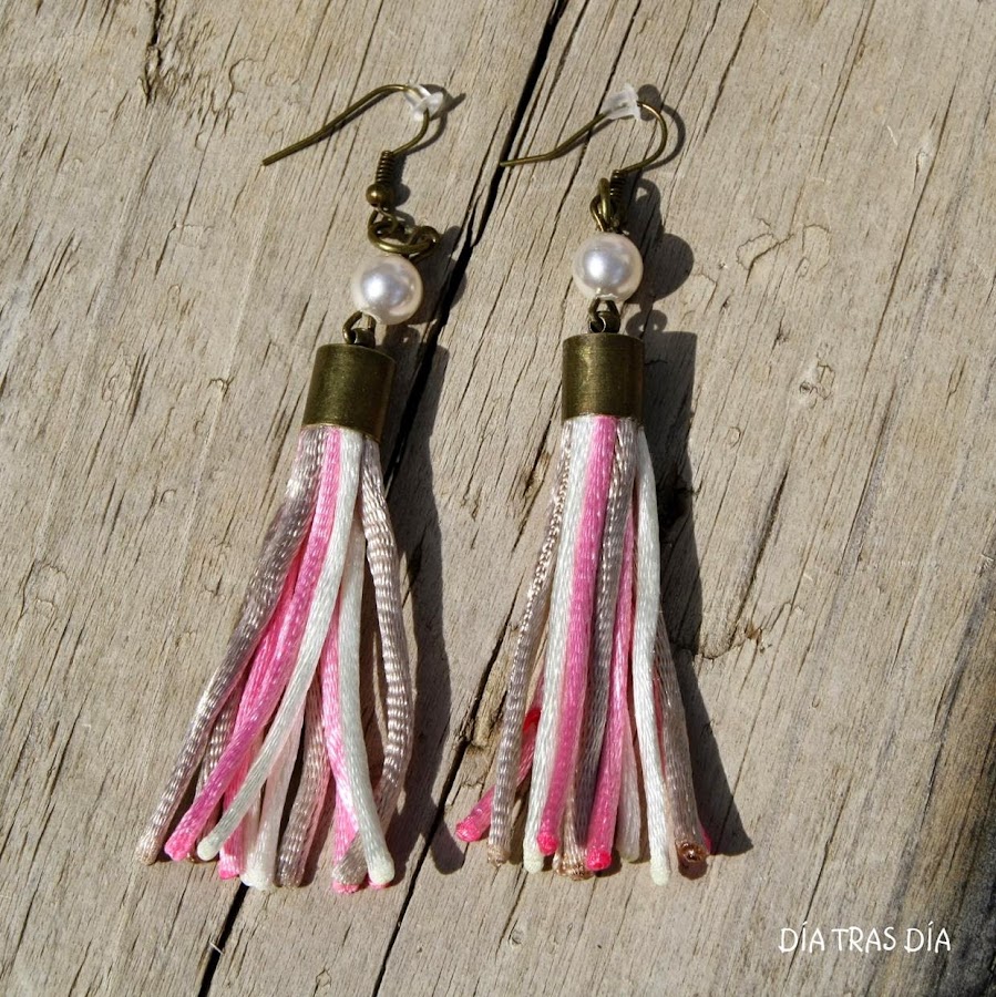 Y cuando terminé la gargantilla y vi que tenía unos pequeños restos de los cordones empleados, pensé que igual podía darles uso. Así que sobre la marcha improviséestos pendientes, que quedaron, para mi gusto, muy sencillos pero vistosos: