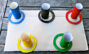 Un trozo de cartón, canutillos de cartón del papel higiénico, unos círculos de cartón coloreados como los aros olímpicos y a probar puntería y habilidad.