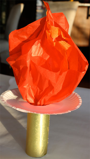 Lo primero que hemos hecho no podía ser otra cosa que una antorcha. Un plato de papel, canutillo de cartón del rollo de cocina, pintura dorada, un poco de papel de seda... a encender el pebetero y que comiencen nuestras Olimpiadas de invierno.