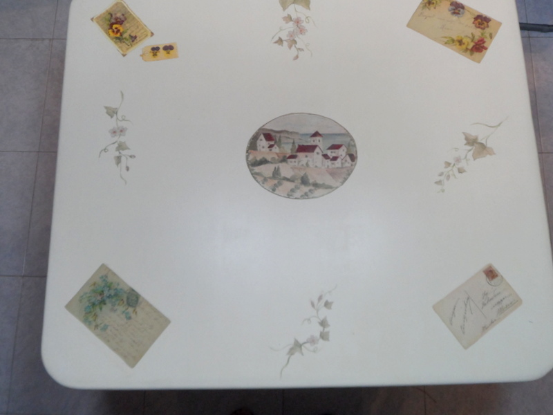 Y esta es la mesa que me ha hecho Antonio para mi cuarto de costura y que yo he decorado,como tengo compañia al coser me hacía falta una,pero cuando esté acabado el conjunto de la mesa con la lámpara que me ha hecho y las sillas,os lo volveré a enseñar y os contaré más sobre este trabajo,pero no podía aguantar sin enseñarosla un poquito.