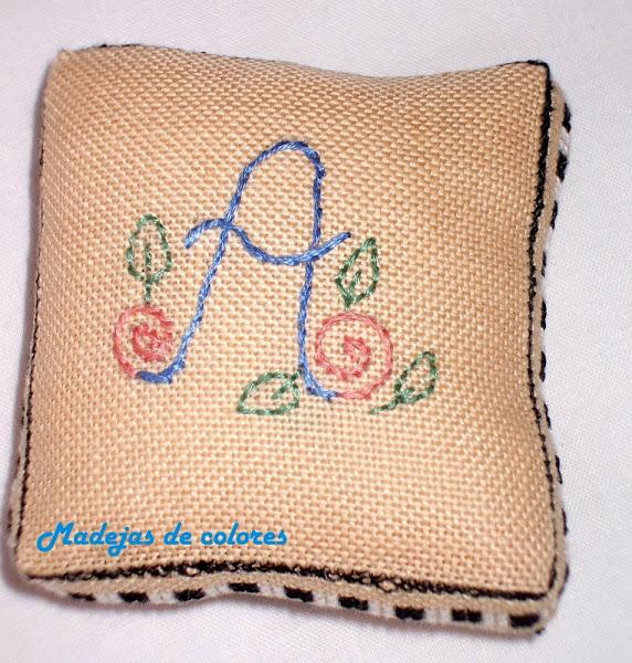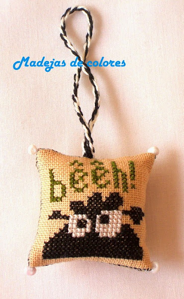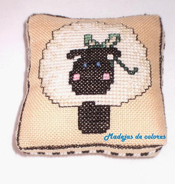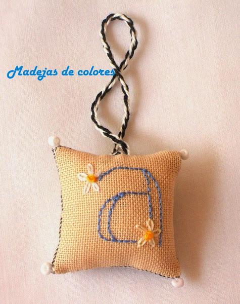 En su trasera también su inicial, en los mismos colores de la oveja, en punto tallo.