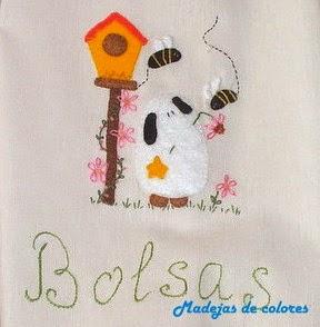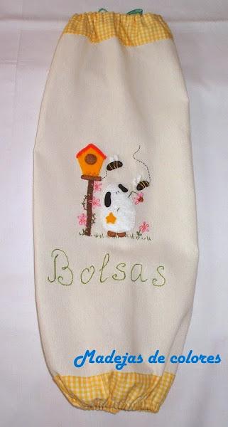 Y para terminar, un guardabolsas con un precioso diseño de la admirada Zulú, todo en fieltro y aplicadas a festón, y algunos bordados, como el ala de las abejas, las flores y la palabra bolsa. Sobre loneta marfil y los extremos tela vichy amarilla y cinta vichy verde como cierre.