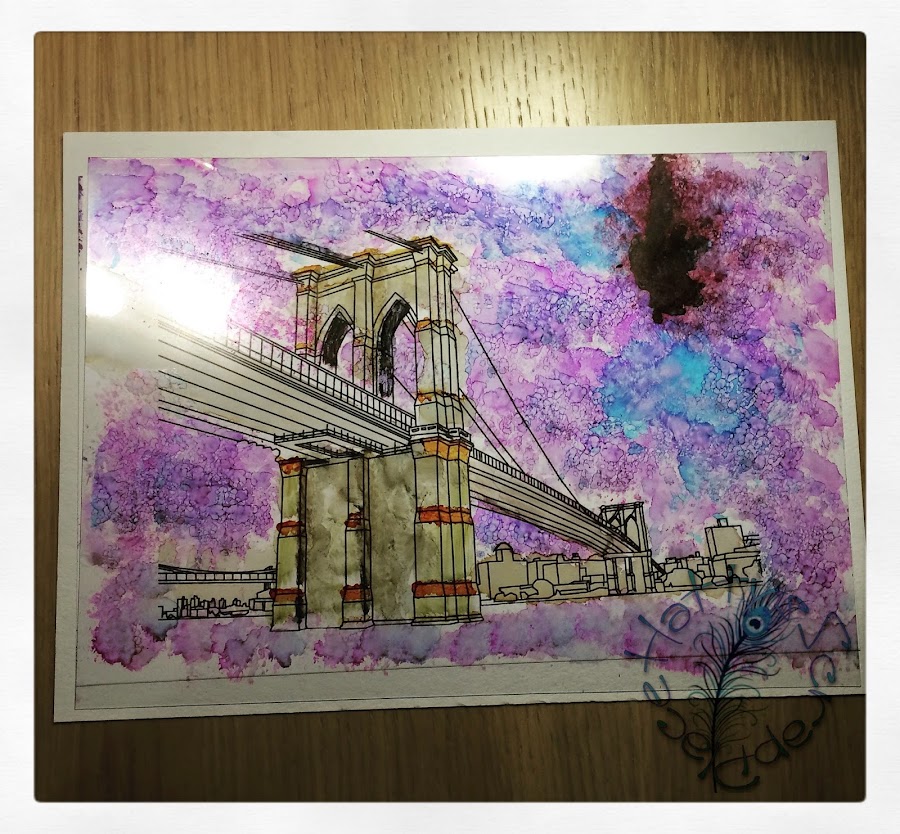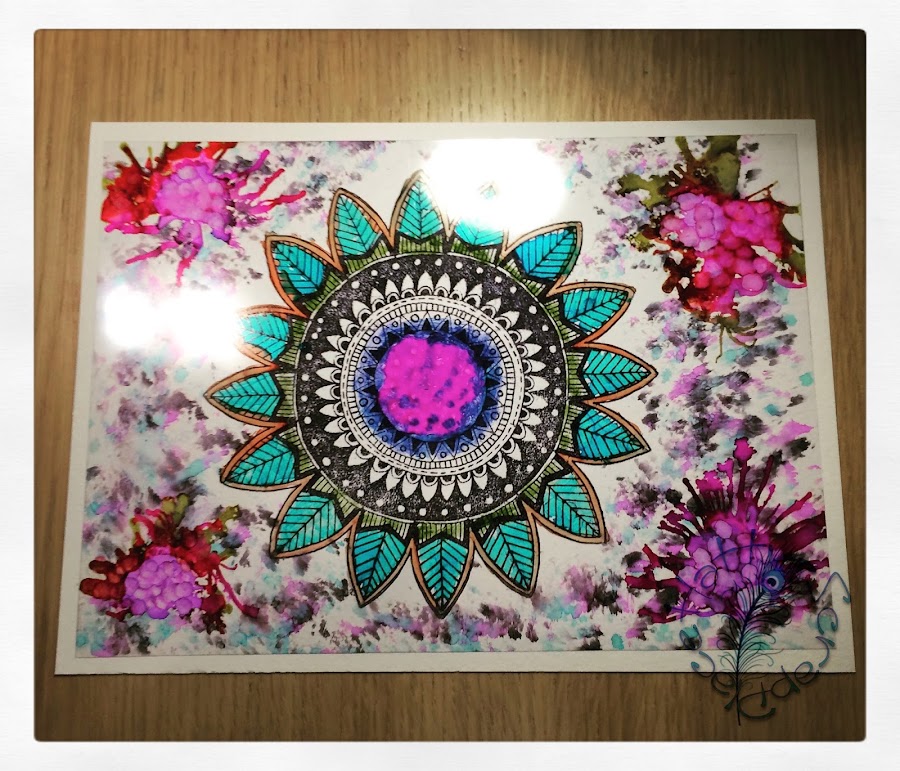 En esta estampamos un sello con Archival Ink y lo pintamos con pincel y usamos técnicas de las anteriores.